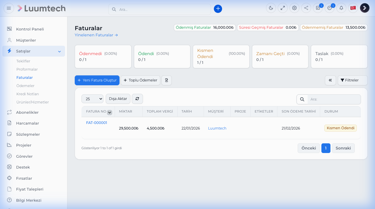 Luumtech CRM'in satış modülü, fatura oluşturma, ödeme takibi, tahmin yönetimi ve detaylı satış raporlaması sağlar. Müşterilerinize profesyonel faturalar gönderebilir ve online ödeme alabilirsiniz.