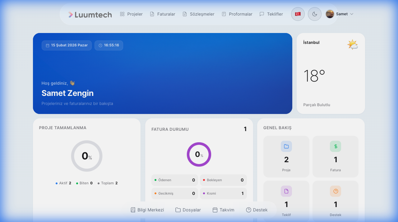 Giriş yaptıktan sonra müşteriler kendi dashboard'larını görür: