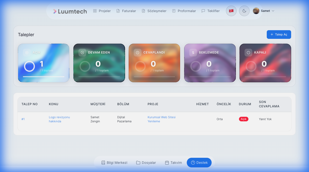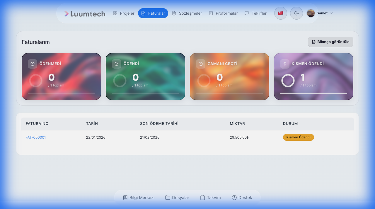 Müşteri Portalı, müşterilerinizin CRM sistemindeki kendi bilgilerine, faturalarına, projelerine ve destek taleplerine erişmesini sağlayan web arayüzüdür.